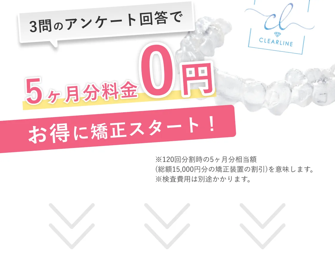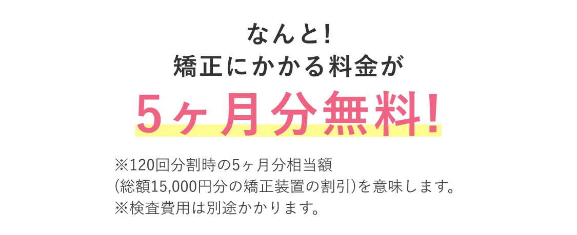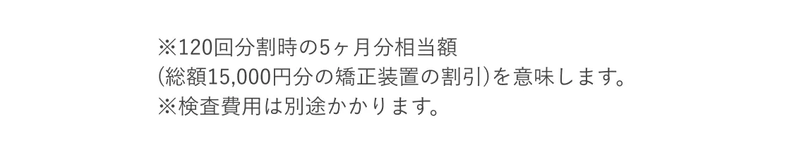 ※120回雲分割時の5ヶ月分相当額(総額15,000円分の矯正装置の割引)を意味します。